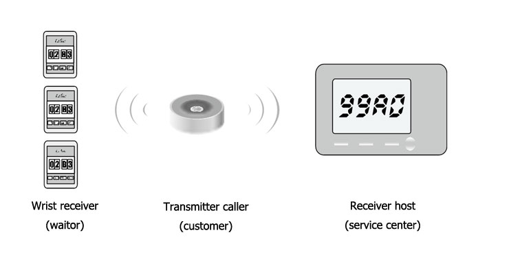 The Wireless Calling server is a RF receiver which is put on the table of wear on the wrist. It can receive the RF signal from the transmitter on each table or other places.